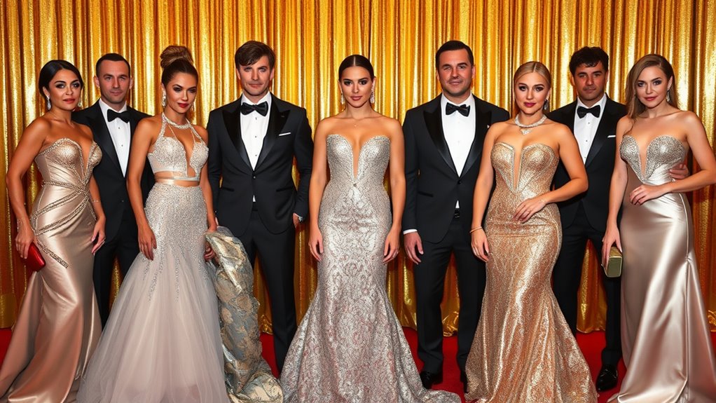 Celebrity accessories played a pivotal role in elevating these looks. You can’t help but admire the statement jewelry, like oversized earrings, layered necklaces, and bold rings that add personality without overpowering the outfits. Some stars paired their gowns with delicate, sparkling hairpins or headbands that subtly shimmered under the lights. Handbags, often overlooked, became focal points—miniature clutches with intricate embellishments or sleek, minimalist designs, complementing the overall look. Footwear also stood out, from metallic stilettos to chunky boots, each choice enhancing the outfit’s vibe. You notice how these accessories aren’t just add-ons but integral components that define the star’s style and mood for the evening. Additionally, the accessorization choices showcased how details can elevate a look from simple to stunning, reflecting current fashion trends where personalization and statement pieces take center stage.