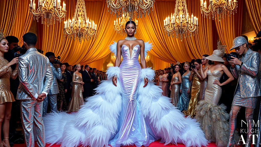 At the 2025 Met Gala, you’ll see bold themes that push fashion boundaries and inspire innovative designs. Expect show-stopping ensembles featuring avant-garde creations, striking accessories, and daring color choices. Celebrities showcase artistic expressions through towering headpieces and intricate details, setting new trends and sparking social media buzz. The event highlights the artistry behind fashion and hints at future style directions. Keep exploring to discover more about the standout moments of this unforgettable night.