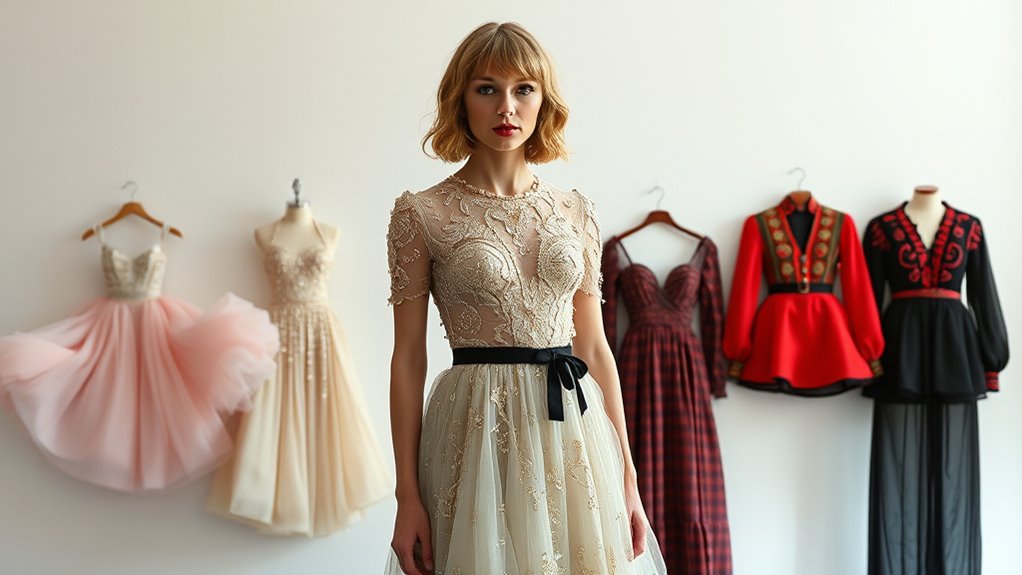 You see her wardrobe as a reflection of her personal growth, evolving with each album era. She often incorporates vintage inspiration, showing her appreciation for timeless styles, and uses color symbolism to convey emotion and themes. As she matures, her outfits become more sophisticated, revealing her journey and self-discovery. This strategic wardrobe choice helps you connect with her story, making her style a visual narrative of her ongoing transformation.