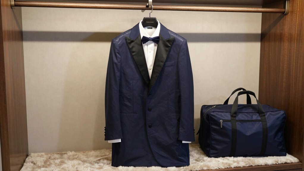 To keep your garment bag pristine, perform prompt, proper fabric care by wiping it with a damp cloth and mild soap. Regularly inspect for stains or damage and spot clean as needed. Follow storage tips by keeping it in a cool, dry place away from direct sunlight. Avoid harsh chemicals; instead, gently clean to safeguard material integrity. This meticulous maintenance ensures your garment bag remains durable, fresh, and ready for your next formal occasion.