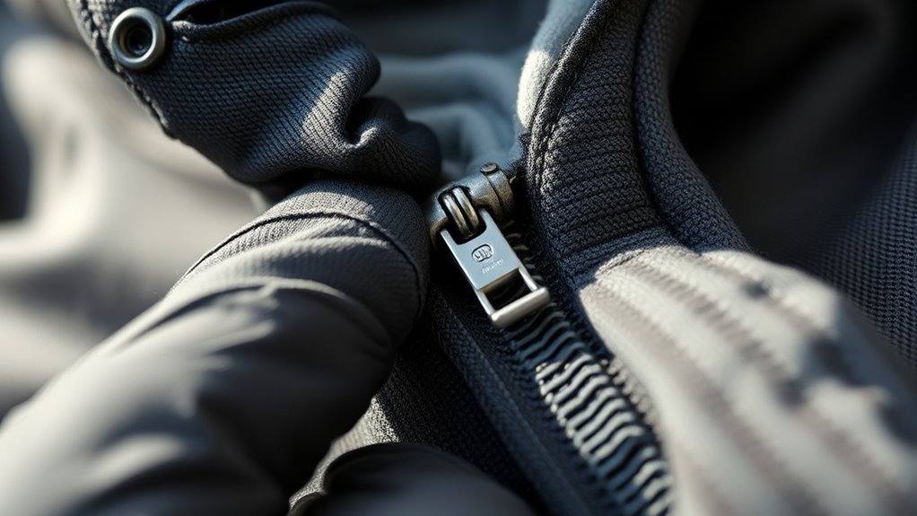 If your waterproof clothing has a broken zipper, don’t worry—you can often fix it with zipper replacement. First, assess whether the zipper can be repaired or needs replacing entirely; waterproof fabric might require special care during the process. You might need to remove the damaged zipper and sew in a new one designed for waterproof gear. This keeps your clothes functional and maintains their waterproof integrity.