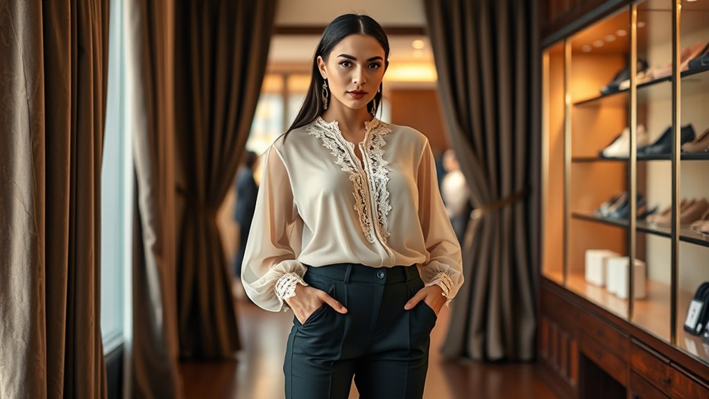 Fabric combinations play a vital role in elevating your sheer styling game. Mixing textures like silk, lace, or satin with sheer fabrics can add richness and dimension. For instance, pairing a sheer chiffon top with a satin slip underneath offers a luxurious feel, while combining lace with sheer panels adds a romantic, vintage vibe. When you select fabric combinations thoughtfully, you elevate the entire look and prevent it from appearing too revealing or careless. Keep in mind that contrast in textures can be striking—think matte against shine or soft against structured—making your outfit visually compelling. Additionally, considering fabrics that work well together can help you craft cohesive and stylish outfits.