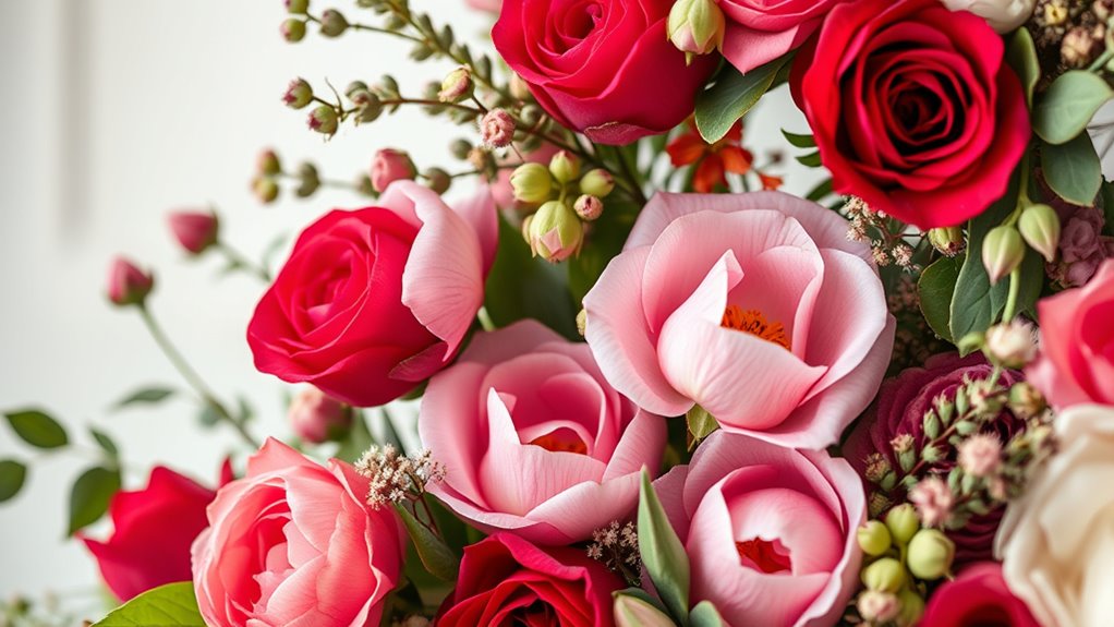 You should choose flowers like roses, peonies, and daisies for floral typography designs. Roses symbolize love, peonies represent prosperity, and daisies convey innocence, adding meaningful flower symbolism to your work. Opt for vibrant color combinations like reds and pinks or soft pastels to make your letters stand out. These flowers and colors help create eye-catching, expressive designs that communicate emotions effectively, making your typography both beautiful and meaningful.