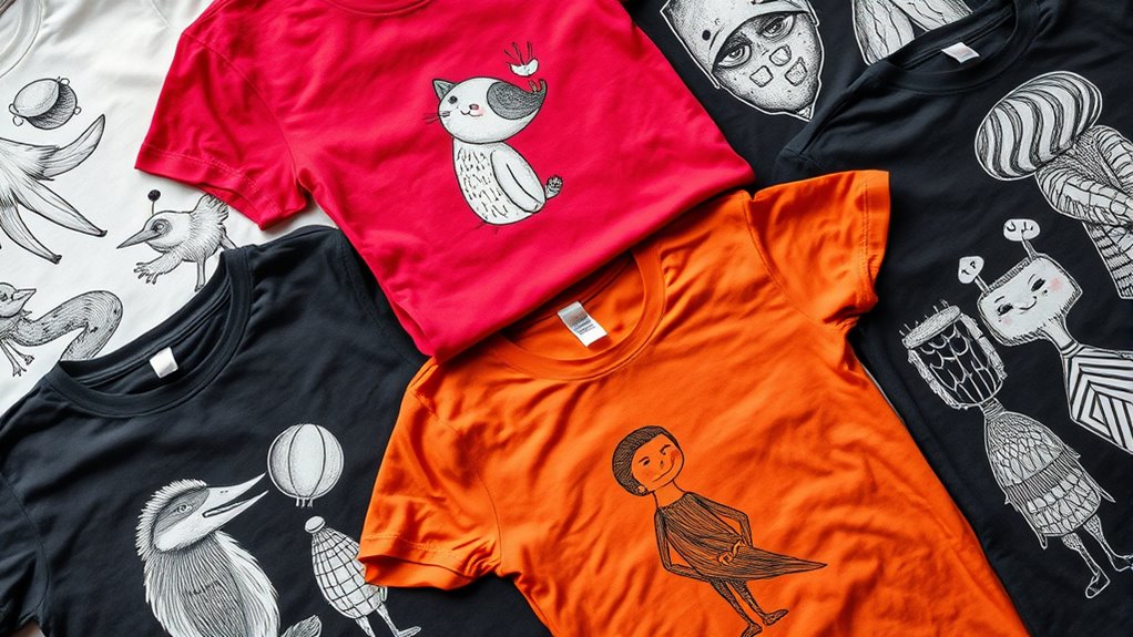 To safeguard your hand-drawn t-shirt designs, use preservation techniques like heat-setting with an iron or professional fabric sealing sprays to lock in the ink. Display methods also matter; keep your shirts out of direct sunlight to prevent fading, and store them flat or folded in acid-free tissue paper. Proper care ensures your sketch art stays vibrant and intact, letting you enjoy your unique designs for years.