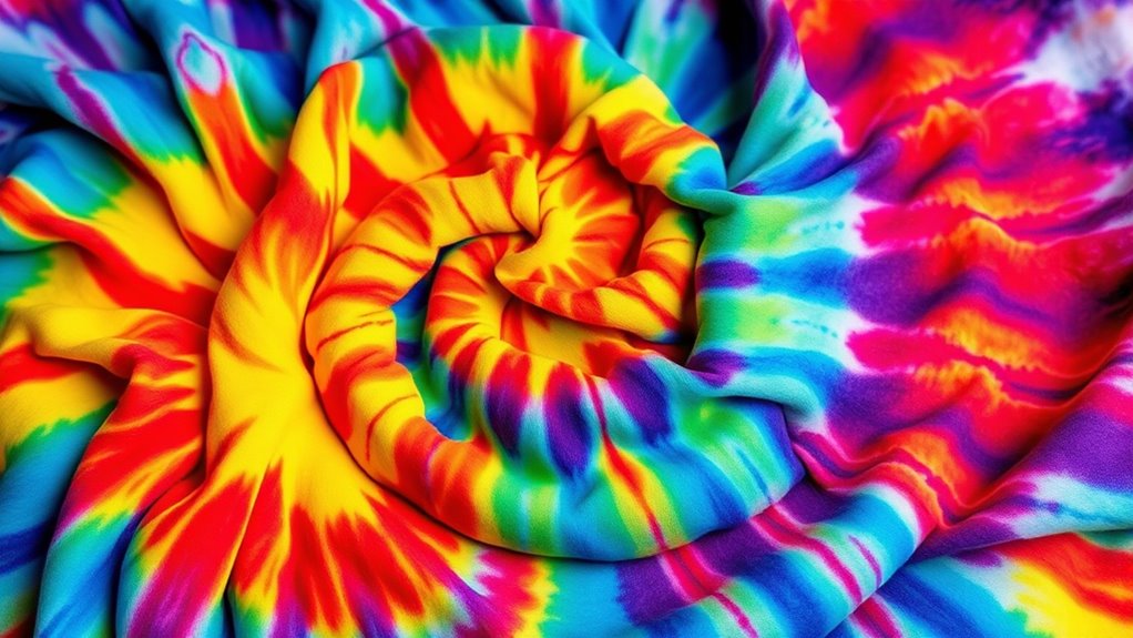 You create psychedelic and tie-dye prints through chemical reactions that fix dyes onto fabric. First, you prepare the fabric with a mordant or chemical fixative that bonds with the dye molecules. When you apply dyes—often reactive or fiber-reactive dyes—they undergo chemical reactions, forming strong bonds with the fabric fibers. This dye fixation process guarantees vibrant, long-lasting colors, giving your prints their signature swirling and vibrant appearance.