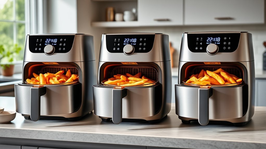 These large-capacity air fryers are like culinary symphonies, allowing me to cook multiple dishes at once. They typically come with dual or even triple racks, so I can prepare everything from crispy fries to roasted veggies simultaneously. It saves me time and effort, making meal prep more efficient. Plus, the even heat distribution guarantees all my dishes come out perfectly cooked, every single time.