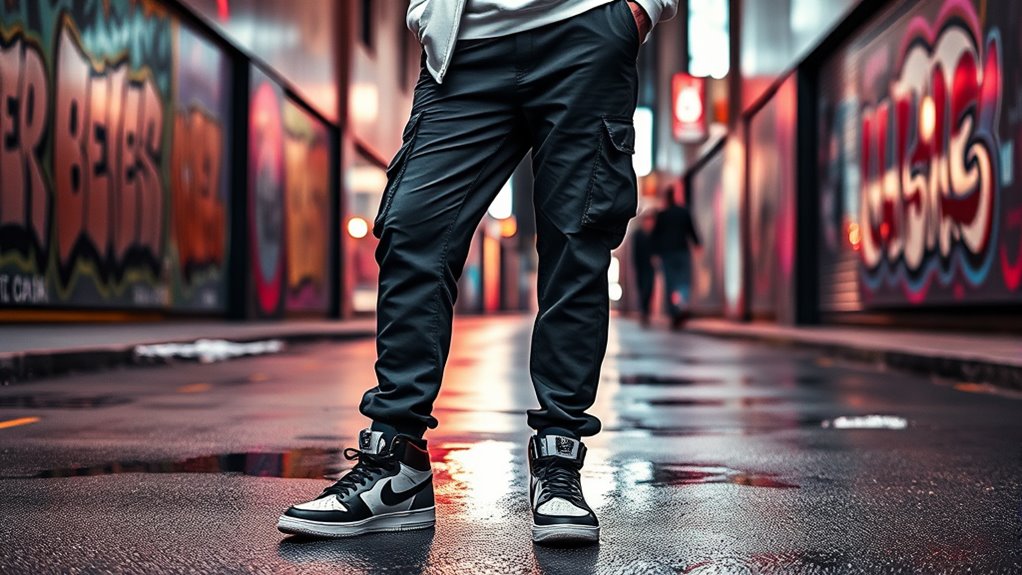 Choosing cargo joggers that are easy to care for can save you time and keep your street style looking sharp. Look for options made from machine-washable fabrics like polyester or cotton blends, which simplify cleaning. Select designs with minimal embellishments and simple stitching to reduce maintenance and prevent damage. Opt for pants with colorfast materials that resist fading, keeping your look fresh after multiple washes. Prioritize styles with reinforced seams and durable pockets to withstand wear and tear from frequent washing. Additionally, features like wrinkle-resistant finishes or no-iron fabrics make routine care even easier. These practical choices ensure your cargo joggers stay stylish and in top condition with minimal effort, so you can focus on your street style without fussing over maintenance.