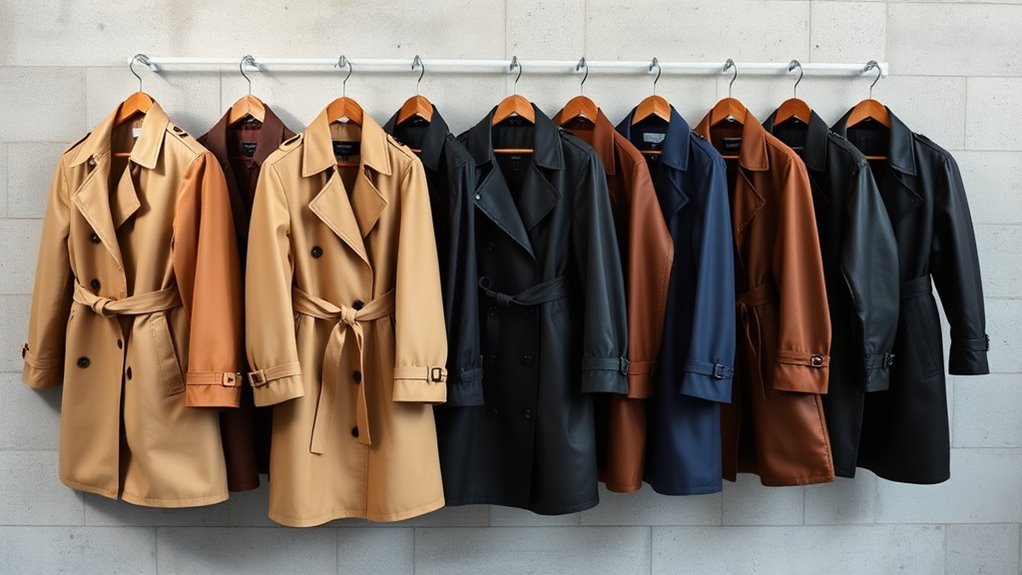 Materials that mimic high-end designer trench coats are like a secret sauce for luxury without the price tag. I recommend looking for gabardine or twill fabrics—they’re durable, smooth, and have that polished finish. Polyester blends with a slight sheen can also give an upscale vibe. These materials feel luxe, hold their shape, and mimic the quality of designer coats, making your outerwear look effortlessly chic.