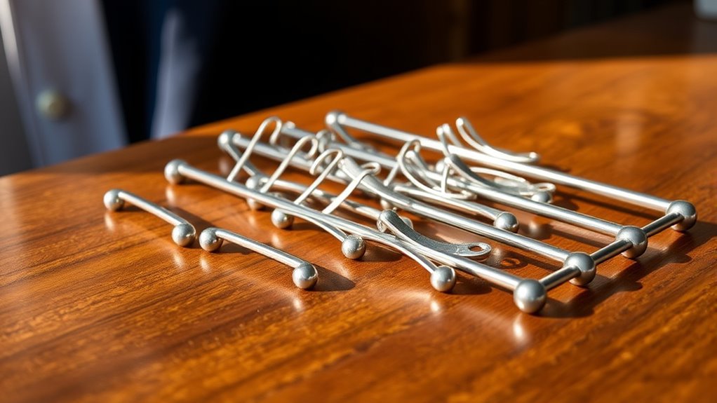 A well-designed storage and portability solution can make a big difference in how easily you keep track of your collar stays. I look for sets that include a dedicated case to keep everything organized and prevent loss. The case should be compact and lightweight, making it easy to carry in a gym bag, briefcase, or even a pocket. Durability is key—materials like sturdy plastic or metal ensure the case holds up over time, securely fitting different sizes without slipping or mixing. Easy access is also important, so I prefer cases that allow quick selection of the right size during busy mornings. Overall, a discreet, portable storage design keeps my collar stays safe, organized, and ready for use anytime I need them.