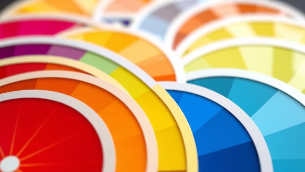 When choosing a fashion-specific color wheel, look for one that highlights harmony and contrast tailored for clothing. I prefer wheels with clear, distinct sections for warm and cool tones, and those that show complementary, analogous, and triadic schemes. A good feature is the inclusion of skin tone guides, helping me pick flattering colors. Additionally, portability and clear labeling make it easier to experiment and build cohesive outfits confidently.
