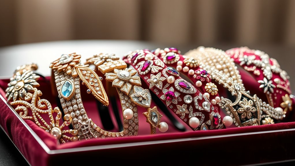 Choosing the right embellished headband depends heavily on the occasion’s formality, so I always consider whether I’m dressing for a formal event or a casual gathering. For formal occasions, I opt for elegant designs with subtle pearls or rhinestones that complement a sophisticated outfit. Casual events call for playful styles with beads or fun embellishments that add a touch of personality. I also match the headband’s embellishments to the overall look and theme, ensuring a cohesive appearance. It’s vital to pick a headband that fits comfortably for long wear, especially during extended ceremonies or celebrations. I also consider the embellishment density—more intricate details for evening events and simpler designs for daytime outings—ensuring the style suits the occasion perfectly.
