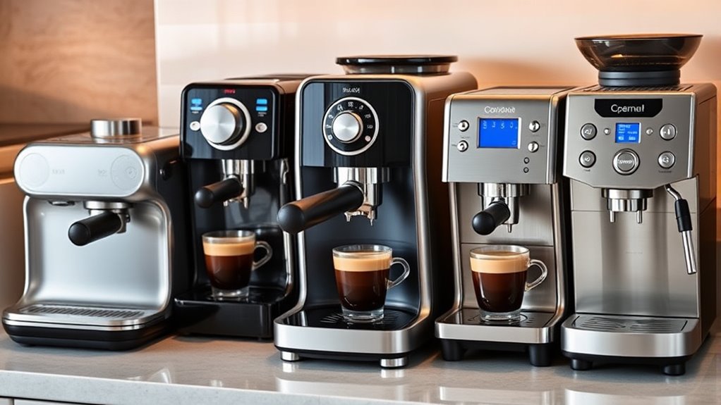 Choosing an espresso machine that’s easy to operate can make a big difference for beginners. Look for models with intuitive controls, like simple buttons or touchscreens, so you don’t get overwhelmed. Features such as preset brewing options and automatic functions help you make consistent drinks without needing to master every manual step. Clear instructions and visual guides boost your confidence and make learning easier. Machines with user-friendly interfaces, including labeled knobs or digital displays, simplify adjusting settings like temperature and shot size. Automated or semi-automatic machines that handle tasks like grinding and tamping remove some of the complexity, making brewing more accessible. Overall, an easy-to-use machine allows you to focus on enjoying your coffee rather than struggling with confusing controls.