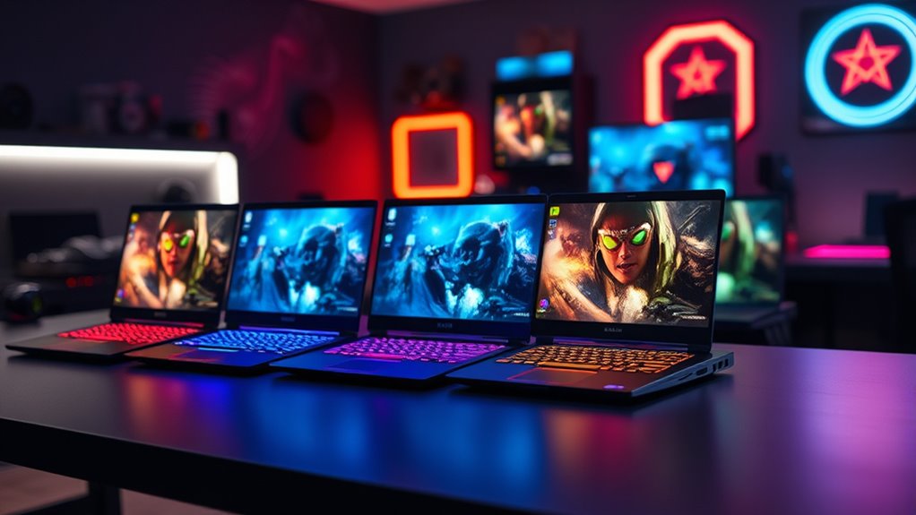 If you’re looking for the best gaming laptops under $1000 in 2025, I’ve got some great options. I recommend models like the HP Victus 15 with AMD Ryzen 5 and RTX 2050, the Lenovo 15″ Gaming Laptop with Ryzen 5 7535HS, ASUS TUF Gaming A16 with RTX 4050, Lenovo LOQ with Ryzen 5 7235HS, and MSI Thin 15. These offer powerful performance, high-refresh displays, and ample storage. Keep exploring, and you’ll find even more tips to choose the perfect gaming machine.