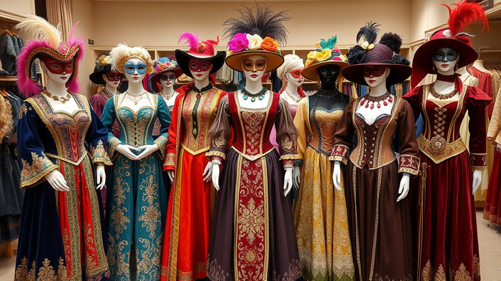 When caring for historic costume replicas, I treat them like delicate artworks—gentle handling and proper storage are key. I always hand wash with mild detergent and avoid harsh chemicals, since these costumes are often made from authentic, fragile materials. I store them in breathable garment bags, away from direct sunlight, to prevent fading. Regular inspections help catch any damage early, ensuring my costumes stay stunning for many events ahead.