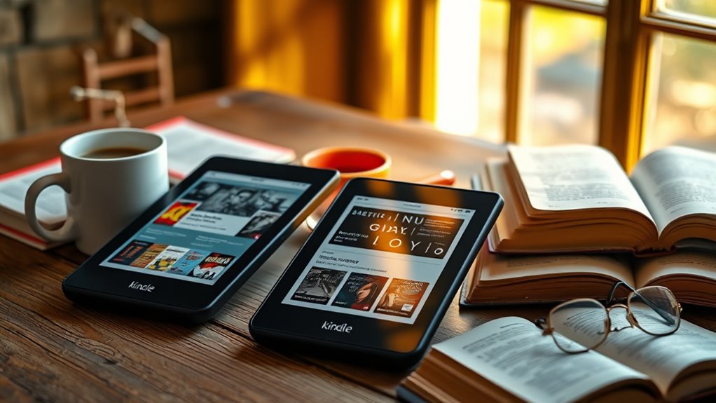 Choosing the right device compatibility is essential to maximizing your Kindle Unlimited experience in 2025. First, verify your device supports the Kindle app or Kindle format so you can access the titles you want. Compatibility includes Kindle e-readers, Fire tablets, smartphones, and other tablets with the Kindle app installed. It’s also important to check for software updates, which help avoid glitches and ensure smooth reading. Make sure your device has enough storage space for multiple downloads, especially if you’re an avid reader. Additionally, consider device-specific features like screen type and resolution, which can greatly impact your reading comfort and clarity. Confirming these factors guarantees seamless access to Kindle Unlimited content, making your reading experience enjoyable and hassle-free.