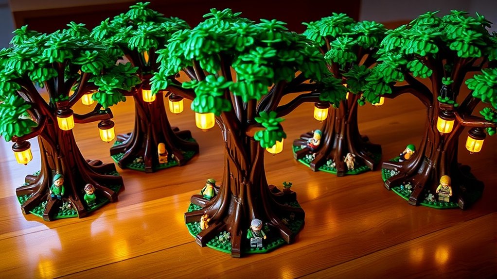 Based on fan rankings for 2025, the top five Lego Zelda Great Deku Tree sets include high-quality models like the 77092 Lego Great Deku Tree with compatible LED light kits, which really boost the display’s visual appeal. Other favorites are detailed sets like the Koroks and the Nifeliz Bonsai Tree for a more natural look. If you’re curious about the best features and accessories for these sets, keep exploring — there’s a lot more to discover.