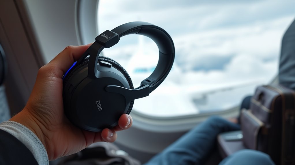 Battery life plays a vital role in guaranteeing your noise-canceling headphones keep up with your travel plans. Longer battery life means you can enjoy extended flights or layovers without constantly recharging. Most models offer between 20 and 70 hours of playback, depending on features and usage. Keep in mind that noise canceling tends to drain batteries faster, especially in active noise-canceling mode, compared to standard listening. Fast-charging is a major plus, providing several hours of use in just a few minutes—perfect for quick breaks. Always check the manufacturer’s estimated playback time to match your travel schedule. If you’re on long journeys, prioritizing headphones with longer battery life or quick-charging capabilities guarantees you stay immersed in your music or podcasts without interruptions.