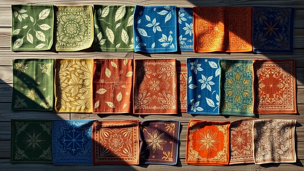 Choosing a high-quality plant-dyed bandana hinges on several key factors that influence the vibrancy and longevity of the color. The plant species used plays a essential role; some plants naturally produce brighter, more lasting hues than others. Proper harvesting and preparation, like using fresh leaves or roots, help guarantee the dye’s strength and consistent color. The mordant or fixative applied during dyeing is crucial, as it enhances how well the dye adheres and resists fading over time. Additionally, the extraction process—specifically temperature and duration—affects the richness and intensity of the color. Environmental conditions during dyeing, such as pH levels and sunlight exposure, can also alter the final hue and its permanence. All these factors together determine the overall quality of a plant-dyed bandana.