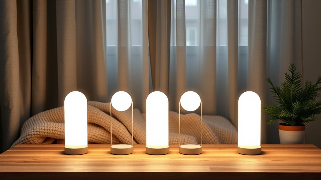 If you’re looking to beat winter blues, I recommend checking out five top sad lamps that combine powerful brightness, customizable settings, and sleek designs. These lamps emit at least 10,000 Lux, offer adjustable brightness and color temperatures, and include features like timers and remote controls for convenience. Their portability means you can use them at home or on the go. Keep exploring, and you’ll find the perfect light therapy option to brighten your mood effectively.