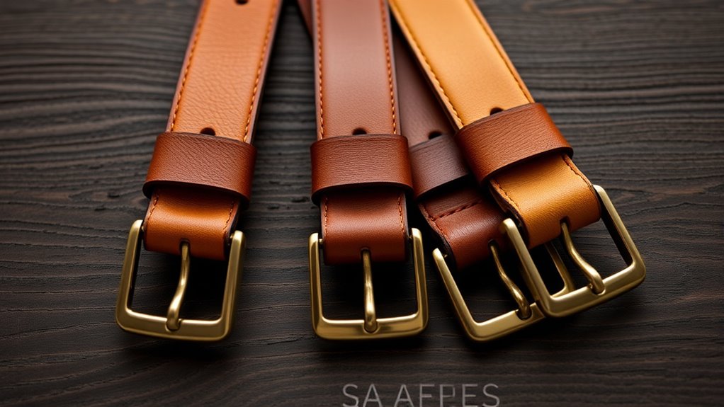 When selecting a vegetable-tanned belt, it’s vital to take into account the ethical and sourcing standards behind its production. I look for belts made from leather sourced from farms that prioritize humane animal treatment and sustainable practices. Reputable suppliers are transparent about their tanning processes, often using natural, non-toxic plant-based dyes and tannins instead of harmful chemicals. This guarantees the leather is eco-friendly and cruelty-free. Certifications or adherence to environmental and social responsibility guidelines are also important indicators of responsible sourcing. I verify that the leather comes from responsibly managed farms and tanneries committed to sustainable practices. Choosing belts with clear ethical sourcing gives me confidence that I’m supporting environmentally conscious production and humane treatment, aligning my choices with my values.