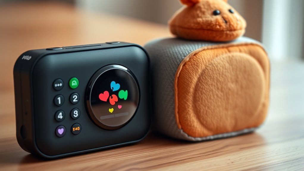 When considering how these devices will grow with your child’s interests, content variety and expansion are key factors. Yoto offers a library of over 1,000 cards, including audiobooks, music, podcasts, and soundscapes, providing extensive options for ongoing growth. Toniebox has hundreds of Tonies, with new releases launching monthly, ensuring a steady stream of fresh stories, songs, and games. Both platforms support customized content—Yoto with Make Your Own cards and Tonies with personalized recordings—making them adaptable to your child’s evolving tastes. Their ecosystems are designed to expand, offering new titles and interactive options regularly. The ease of adding new cards or Tonies keeps content fresh, engaging, and aligned with your child’s developmental stages, fostering long-term interest and learning.